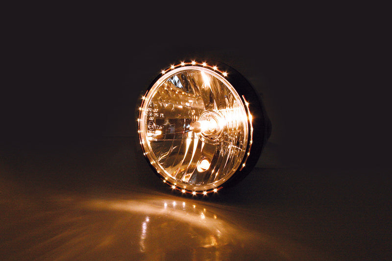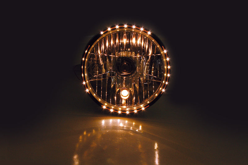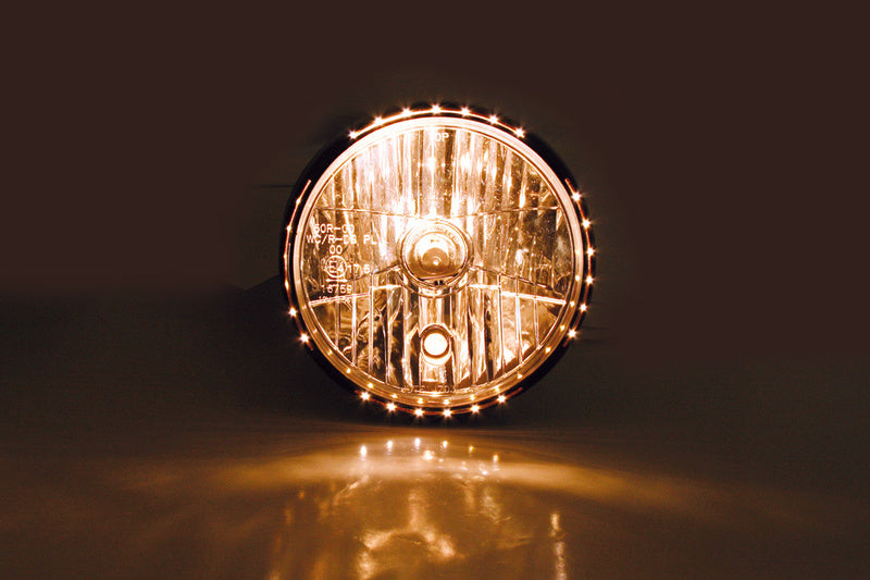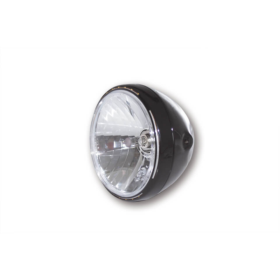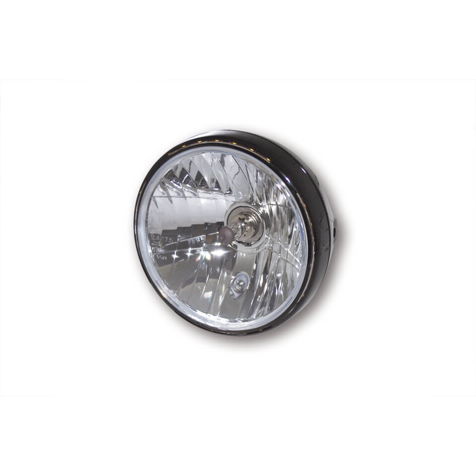 7 Zoll Hauptscheinwerfer mit LED Positionsleuchte im Lampenring. H4 Prismen Reflektor in einem schwarzen oder verchromten Metallgehäuse mit seitlicher M8 Befestigung. E-geprüft.